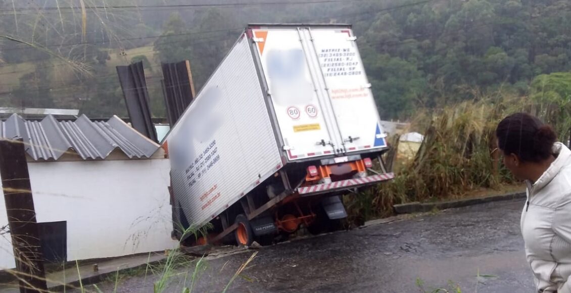 Um caminhão ficou pendurado em uma ribanceira na Rua José José Poletti, no bairro Rui Sanglard, em Nova Friburgo (RJ), na manhã de segunda-feira (26/8).