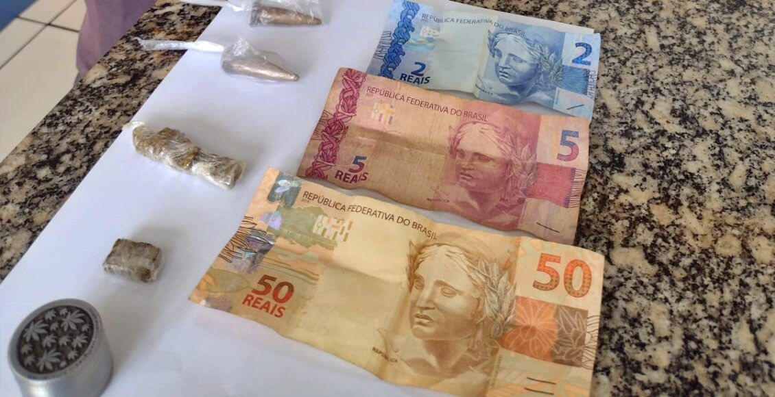 A PM encontrou com ele 2 pinos de pó branco, 2 tabletes de erva seca prensada, 1 triturador (dichavador) e R$ 57,00 em espécie.