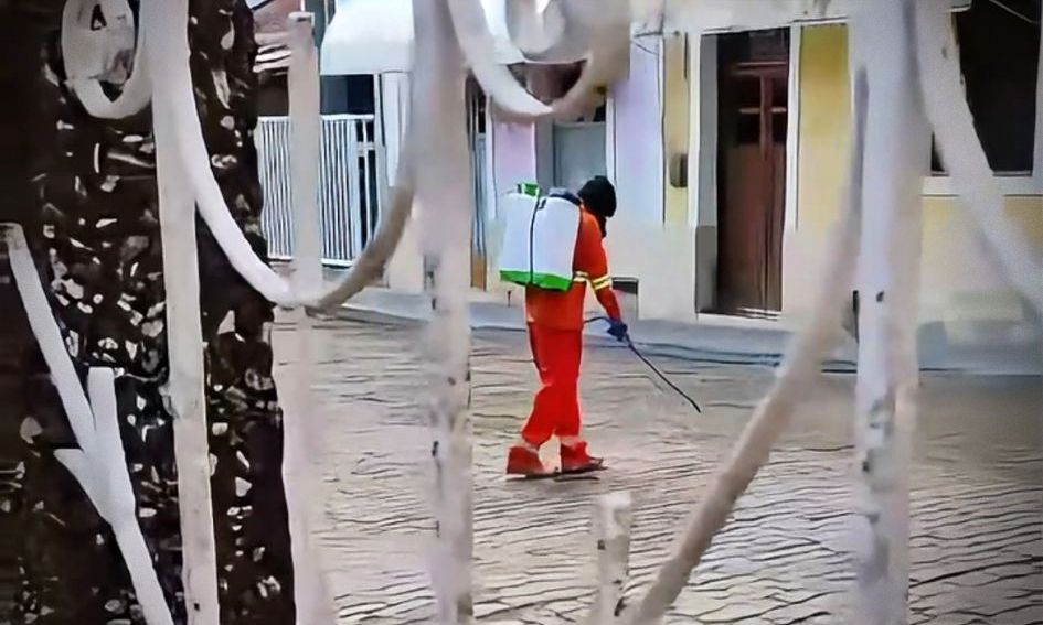 Nas imagens, um trabalhador da Prefeitura – usando máscara e bomba costal – aparece borrifando um produto suspeito ao longo da via pública. Segundo o registro, ele percorre toda a extensão da rua aplicando o produto entre os paralelepípedos, supostamente para eliminar o mato.