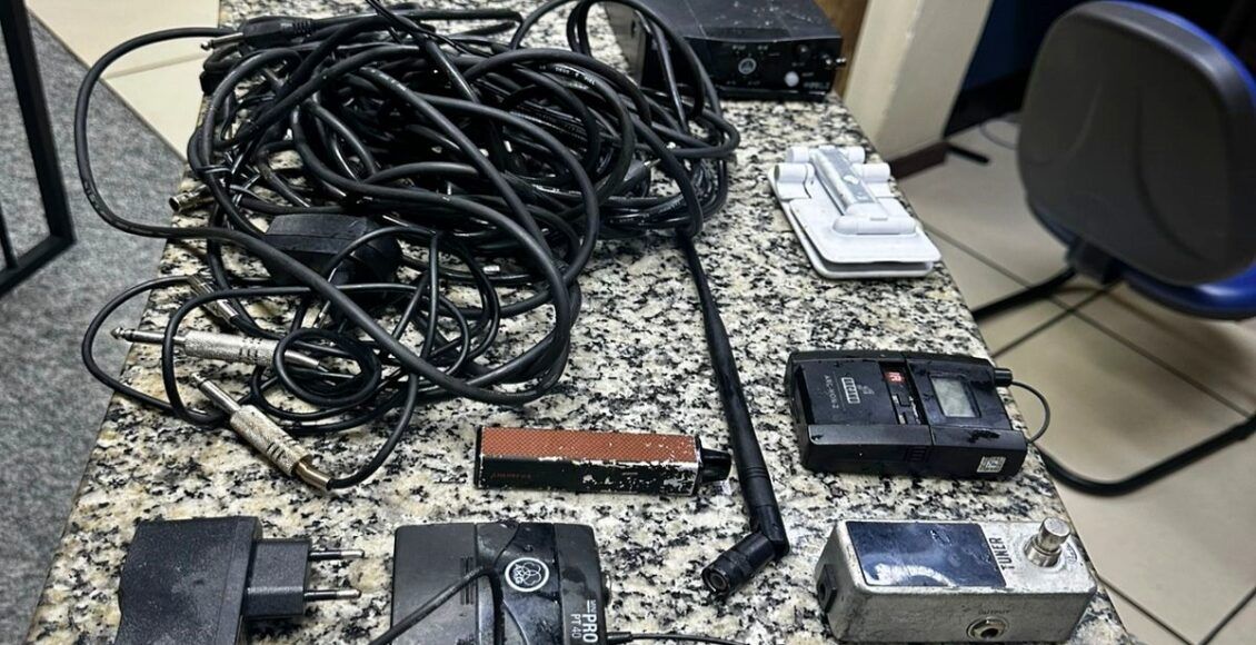 No local, os policiais recuperaram um monitor sem fio, um rádio transmissor, um fone moldado, dois pedais e vários cabos.