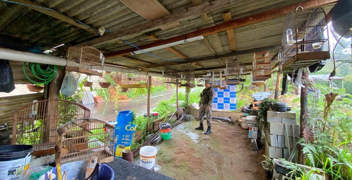 Policiais da Unidade de Policiamento Ambiental do Parque Estadual dos Três Picos foram até uma residência na Rua José Acidino Pinto, no bairro Rui Sanglard, e encontraram diversas gaiolas penduradas em uma varanda. Um morador informou que as aves pertenciam ao pai, que não estava no local, e que desconhecia a necessidade de licenças para mantê-las.