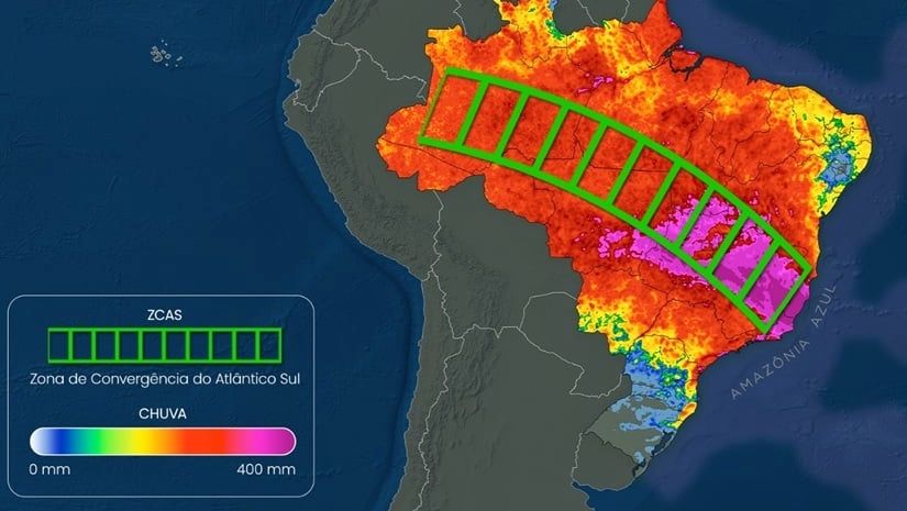 Projeção é do ClimaTempo. A Zona de Convergência do Atlântico Sul (ZCAS) volta a se organizar sobre o Brasil entre os dias 19 e 23 de janeiro de 2026, trazendo risco de chuvas intensas e transtornos em diversas regiões do país. Este será o segundo episódio de ZCAS registrado em janeiro, fenômeno típico do verão e um dos principais responsáveis pelos períodos prolongados de chuva no território brasileiro.