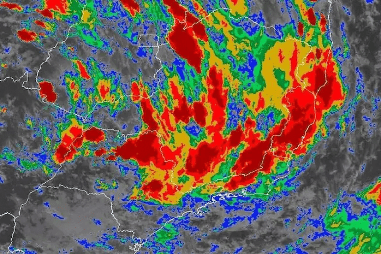 Formação de supercélulas. Imagem: InmetO estado do Rio de Janeiro está em alerta vermelho para chuvas intensas, com risco elevado de temporais, alagamentos, deslizamentos de terra e transbordamento de rios. O aviso de grande perigo foi emitido pelo Instituto Nacional de Meteorologia (Inmet) e abrange todo o território fluminense, além de áreas do Espírito Santo, Litoral Paulista, Vale do Paraíba e cidades da Zona da Mata de Minas Gerais.