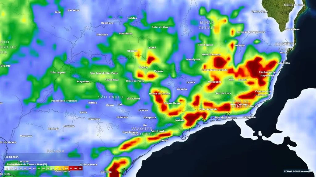 O avanço da frente fria no Sudeste altera a circulação dos ventos sobre o país e intensifica as áreas de instabilidade. Ao mesmo tempo, o predomínio de calor e umidade favorece a formação de nuvens carregadas, principalmente entre a tarde e a noite, período em que há maior probabilidade de chuvas fortes na região Sudeste.