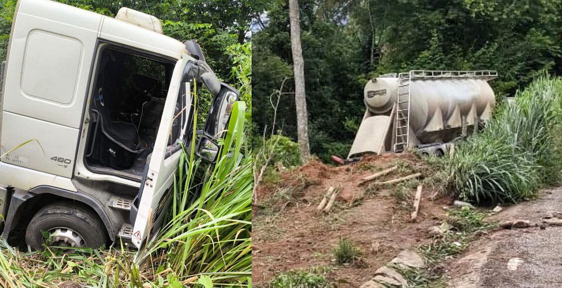 Carreta sai da pista ao perder curva na RJ-160, em Cantagalo