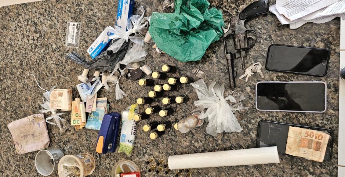 Durante a ação, os policiais encontraram dentro da residência um revólver calibre .38, munições, drogas, dinheiro em espécie, anotações relacionadas ao tráfico e um veículo com registro de furto.