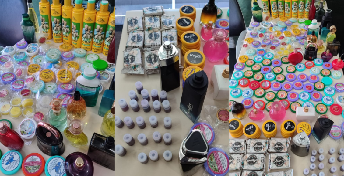 Entre os itens recolhidos estavam sabonetes, pomadas conhecidas como “canela de velho”, perfumes de origem duvidosa e essências sem comprovação de procedência.